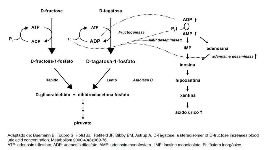 Figura 1. Mecanismo de D-Tagatosa en la síntesis de ácido úrico.Un estudio en hombres sanos reportó que una carga de 30 g de D-tagatosa resultó en una acumulación intracelular significativa de D-tagatosa-1- fosfato del orden de 1 mmol L-1 en el hígado humano luego de 30 min tras su ingesta. Además, el peak de D-tagatosa-1-fosfato coincidió con una disminución de ATP hepático del 12%, que corresponde a aproximadamente 0,30 mmol L-1 ATP37. En otro estudio similar se observó una disminución leve y transitoria del Pi sérico solo a los 50 y 400 min. post ingesta de 30 g de D-tagatosa28. Sin embargo, en otro estudio el nivel de fósforo plasmático no fue significativa tras la ingesta de 75 g de D-tagatosa29.