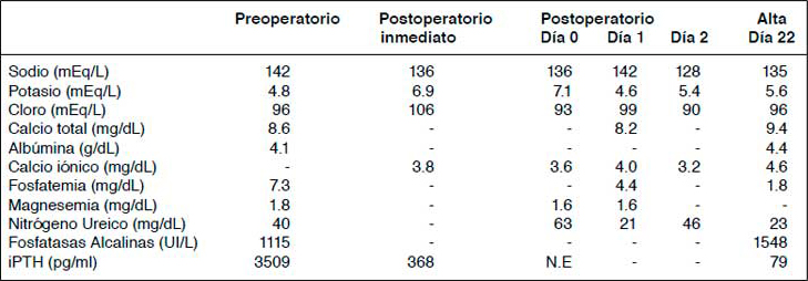 En el postoperatorio inmediato cursó con hiperkalemia hasta 7.1 mEq/L con cambios electrocardiográficos, que requirió traslado a Unidad de Cuidados Intensivos y hemodiálisis de urgencia. Posteriormente, persistió con tendencia a la hiperkalemia y precozmente desarrolló SHH con hipocalcemia, hipofosfatemia e hipomagnesemia de difícil manejo (Tabla 1).
