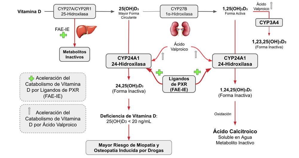 El PXR (Antes llamado receptor esteroidal y xenobiótico o receptor activado por pregnano) es un receptor intracelular que juega un importante rol en la detoxificación de xenobióticos y drogas. Se expresa en células del tracto GI, riñones e hígado y muestra una homología del 60% con el receptor de VD en el dominio de unión al ADN. El PXR puede por ello unirse a los elementos de respuesta a VD y, como un factor de transcripción, afecta la expresión génica normalmente regulada por esta vitamina. Varias drogas pueden interferir en este balance a través de la activación del PXR. Los PXRligandos son estructuralmente diversos e incluyen una amplia variedad de agentes farmacológicos tales como antiepilépticos, antiinflamatorios, antirretrovirales y algunas hierbas. A través de la activación del PXR, la expresión de las 24-hidroxilasas es estimulada conduciendo a una degradación incrementada de 25(OH)D3 y 1,25(OH)2D3 (Figura 1)7. Este mecanismo explicaría por qué la HD es más frecuente frente al uso de FAE-IE, sin embargo, también se presenta en consumidores de FAENIE10. Estudios in vitro han mostrado interesantemente que el valproato (una FAE-NIE) induciría tanto a CYP24A1 como a CYP3A4, alterando la homeostasis del calcio y VD11 (Figura 1). Sin embargo, la osteopatía inducida por ácido valproico, no puede explicarse por una inducción de 24-hidroxilasas a través de la activación de PXR, ya que el ácido valproico inhibe las enzimas del citocromo P450 y no es un ligando del receptor X de pregnano14.
