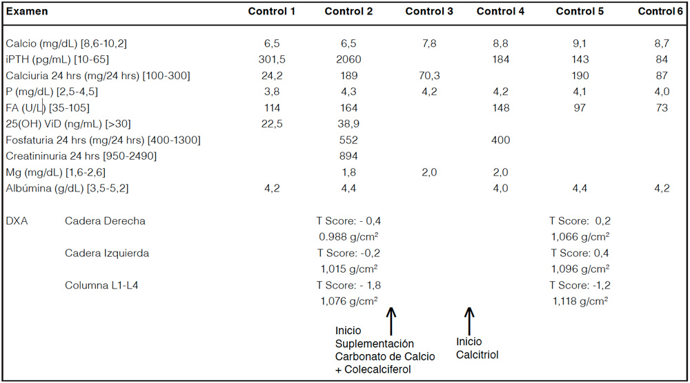 En exámenes realizados en atención primaria destaca calcemia 6.5 mg/dl, fosfemia: 3.8 mg/dl, albúmina: 4,2 g/dl, paratohormona (PTH): 301 pg/mL, 25OHVD: 22,5 ng/ml con función renal normal (Tabla 1, control 1). Se solicita nuevo estudio bioquímico evidenciándose similares alteraciones destacando PTH: 2.060 pg/ml e hipocalcemia persistente con fosfemia normal. Destaca además la presencia de calcificaciones de ganglios basales en resonancia magnética cerebral solicitada por neurólogo tratante. Se plantea Pseudohipoparatiroidismo (Resistencia a PTH) como una de las posibilidades diagnósticas y se solicita estudio de los ejes hormonales asociados a proteína G, los cuales resultan todos normales. Estudio de malabsorción intestinal / Enf.celíaca negativo. Se indicó carbonato de calcio / Vit D3 (320 mg/125 UI) 2 comprimidos tres veces al día durante dos semanas persistiendo HC pese a tener niveles suficientes de VD (Tabla 1, control 3). Por lo anterior se plantea interferencia de FAE sobre niveles de 1,25 OHVD biodisponible decidiéndose agregar a su terapia calcitriol, forma activa de la VD, en dosis de 0,5 mcg/día. Luego de tres meses se observa normalización de calcio y PTH (Tabla 1, control 5 y 6) y ganancia en su densidad mineral ósea tras 24 meses de tratamiento. Debido a la HC gatillada por el uso de CBZ, se solicita a neurólogo tratante cambio de FAE quedando finalmente en tratamiento con levetiracetam 500 mg diarios.