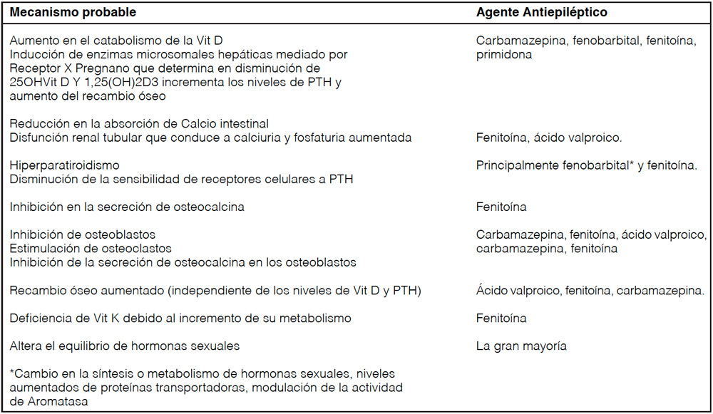 Las alteraciones de la integridad ósea inducidas por FAE son principalmente influenciadas por el tipo, dosis y duración de la terapia antiepiléptica. Durante el tratamiento con carbamazepina, oxcarbazepina, clonazepam, fenobarbital, fenitoína, primidona y ácido valproico; se observó un aumento en el riesgo de fracturas dosis dependiente. La enfermedad ósea inducida por FAE fue mayor con inductores del citocromo P450 (CYP), es decir, carbamazepina, fenobarbital, fenitoína y primidona, que con otros agentes antiepilépticos15,16 y también puede provocarse con antiepilépticos de 2da generación, como gabapentina, lamotrigina y levetiracetam, que tienen poco o ningún efecto sobre la actividad enzimática del citocromo8. Esto respalda la idea de que otros mecanismos están implicados en la alteración de la integridad ósea, algunos con efecto directo de las FAE sobre el metabolismo del calcio17,18 (Tabla 2).