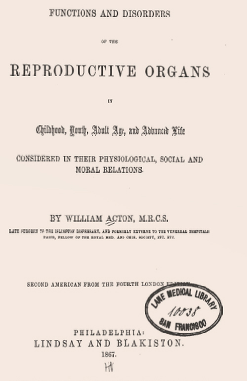 B-S vivió en un Londres victoriano y uno de sus mitos establecía que el exceso de actividad sexual debilitaba a los varones. B-S llegó así a convencerse que el testículo producía un principio vigorizante que se perdía en el semen en los varones sexualmente incontinentes. El mito en cuestión fue oficializado en el libro de William Acton, un célebre ginecólogo londinense (Las funciones y desórdenes de los órganos reproductivos en la juventud, la edad madura y la vejez, 1857) (Figura 3), especie de biblia inglesa del tema sexual. En él, Acton introdujo el término espermatorrea, definida como “estado de enervación producido por pérdida excesiva de semen”, un cuadro inexistente. Como el libro tuvo un éxito enorme, Acton recibía innumerables pacientes varones a los cuales aconsejaba mantener al mínimo su actividad sexual si querían mantener, o recuperar, sus fuerzas físicas y mentales. En suma, esta “autoridad médica” de su época pretendió reducir la compleja sexualidad humana a su aspecto meramente reproductivo, ni más, ni menos.