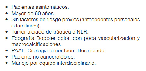 La multicentricidad tumoral y los antecedentes familiares del carcinoma de tiroides no son contraindicaciones para la VA. Se resume en la figura 3 el perfil ideal la misma.
