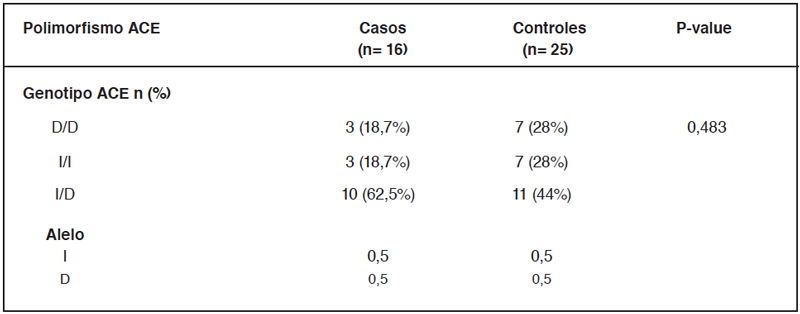 Extracción de ADN genómico: La determinación del polimorfismo ACE I/D en casos y controles, se realizó a partir de ADN genómico utilizando un kit comercial (E.Z.N.A Blood DNA Mini Kit) y se amplificó el fragmento específico mediante PCR convencional utilizando partidores específicos para detectar el alelo D en el gen ACE1. Secuencias: (Forward: 5′-CTGGAGACCACTCCCATCCTTTCT-3′ y Reverse: 5′-GATGTGGCCATCACATTCGTCAGAT-3′). Posteriormente, los fragmentos amplificados fueron corridos en un gel de agarosa al 2%, como ha sido previamente descrito16.