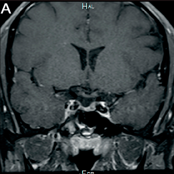 Se realiza diagnóstico de deficiencia de arginina-vasopresina central y se inicia desmopresina intranasal a demanda. Se realiza una RMN con enfoque selar, que reporta una lesión hipofisaria que compromete glándula y tallo hipofisario (Figura 1).
