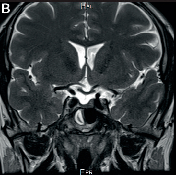En cuanto a las manifestaciones endocrinológicas, la deficiencia de arginina-vasopresina es la más frecuente. Esta manifestación debe sospecharse ante pacientes con síndrome poliurodípsico, a veces con avidez por agua fría en las noches. El diagnóstico se realiza si existe hipernatremia con hiperosmolaridad sanguínea e hipoosmolaridad urinaria. En los casos con mecanismo de la sed intacto, donde no se desarrolla hipernatremia, se puede confirmar con la prueba de restricción hídrica. En la RMN, se puede observar una pérdida de brillo de la neurohipófisis en secuencia T1 y engrosamiento del tallo pituitario2.