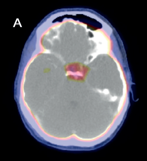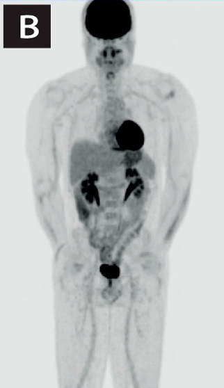 En el seguimiento, se solicitó una tomografía por emisión de positrones (PET-CT) en búsqueda de lesiones en otras regiones corporales. Se evidenció un aumento de captación en sector lateral izquierdo en región selar sin correlato morfológico, lo que es inespecifico. No se evidencian lesiones en pulmones ni en estructuras óseas (Figura 3). Se plantea que el paciente está en remisión, y se continuará su seguimiento.