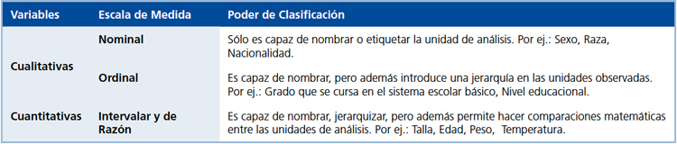 Escalas de medida: Cuando procedemos a medir las variables del estudio, debemos tener presente que estamos consignando valores con unidades de medida y, por consiguiente, introduciendo unidades de medida. Estas escalas de medidas pueden ser: Nominales, Ordinales o Intervalares (o de Razón). Estas escalas tienen diferente Poder de Clasificación. Presentemos el siguiente esquema: