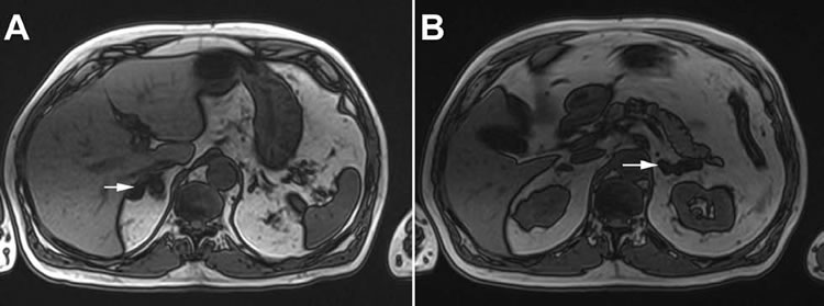 Es de gran trascendencia la identificación de los receptores hormonales aberrantes en la glándulas suprarrenales de pacientes con hiperplasia e hiperproductores de cortisol, ya que ello, hoy en día, puede abrir la oportunidad para tratamientos específicos como alternativa a la adrenalectomía, usando moléculas que inhiban la producción del ligando endógeno o antagonicen al receptor. En esta línea y según el tipo de receptor involucrado, se han probado distintos tratamientos, como octreotide para bloquear la liberación postprandial de GIP, bloqueadores del receptor adrenérgico ß y AII, acetato de leuprolide para bloquear la secreción de LH y antagonistas del receptor de vasopresina tipo 11,12. Sin embargo, pese a la disminución de secreción de cortisol, no han mostrado eficacia clínica mantenida ni regresión del tamaño tumoral, Figura 1. RM con crecimiento polinodular de ambas glándulas suprarrenales (flechas) al momento del diagnóstico de HSMIA (A. derecha y B. izquierda). La RM de control, un año después de la suprarrenalectomía derecha, no mostró variación de la suprarrenal izquierda. siendo posible que existan otros mecanismos genéticos o vías involucradas en la proliferación celular.