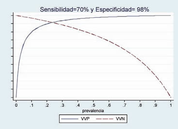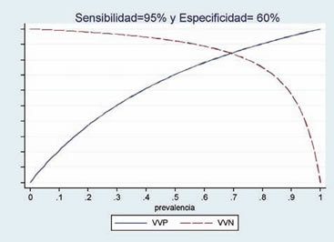 Es decir tanto el VPP y el VPN son funciones de la prevalencia, para una sensibilidad y una especificidad dadas. Por ejemplo para una sensibilidad de 0,85 y una especificidad de 0,89 (de los datos de la Tabla 3), las expresiones anteriores son: