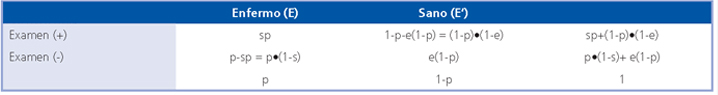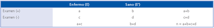 En consecuencia, al aplicar una prueba diagnóstica a una población, el número de sujetos sometidos al examen, n, se particiona según la siguiente tabla: