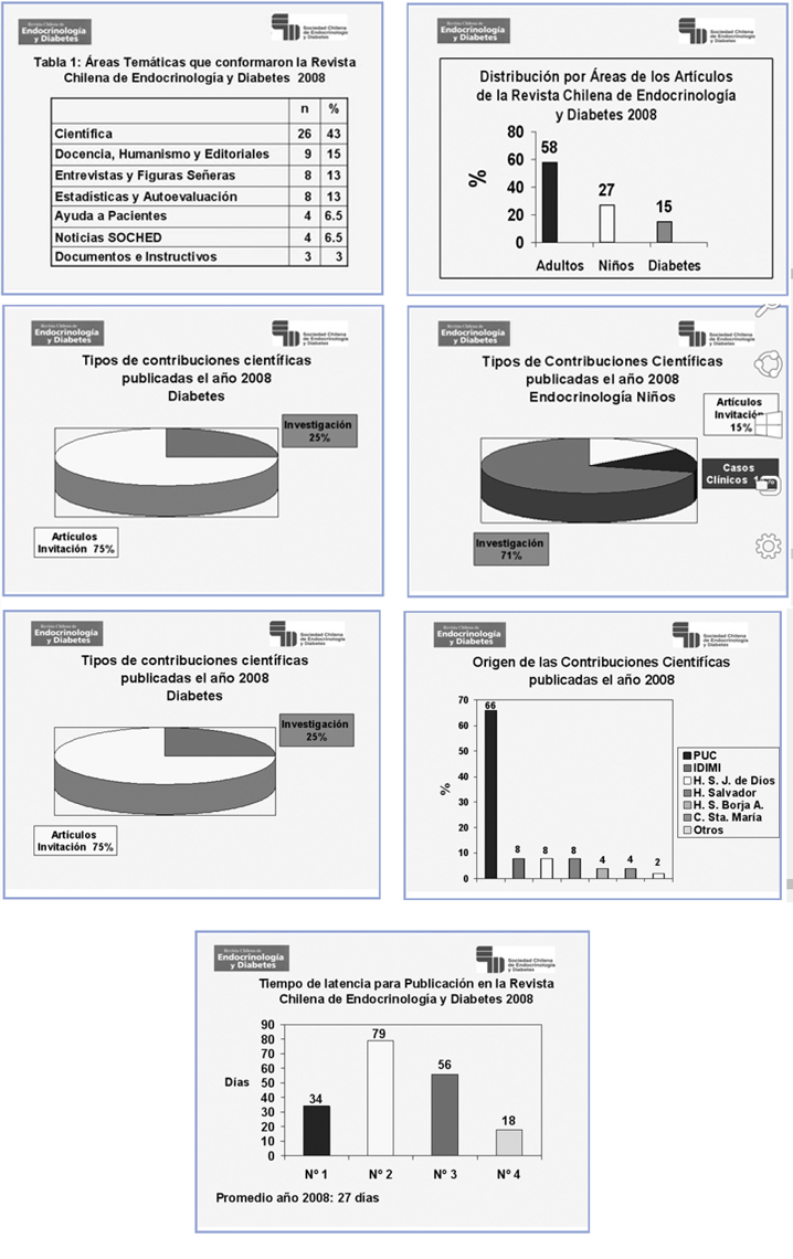 Durante el XIX Congreso Chileno de Endocrinología y Diabetes, efectuado en Puerto Varas, se invitó a los socios y lectores de la Revista a llenar un formulario encuesta que les permitiera dar su opinión sobre la misma. Se recolectó un total de 67 respuestas que se expresan porcentualmente a continuación.