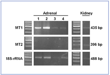 Hasta ahora no había sido investigada la presencia de receptores de melatonina en la glándula suprarrenal humana. En este estudio, encontramos por primera vez la expresión del mARN del receptor MT1 en las 3 muestras analizadas de tejido suprarrenal normal y en una de adenoma suprarrenal. La expresión del mARN del receptor MT2 no se detectó en ninguna de las muestras de tejido suprarrenal, usando las mismas concentraciones de cADN usadas para analizar el receptor MT1. En cambio detectamos la expresión de mARN para el receptor MT1 y MT2 en el tejido humano renal como ha sido previamente publicado21 y fue usado como control positivo. Estos resultados son similares a los observados por nosotros en la corteza suprarrenal de la rata y del mono capuchino8-10.