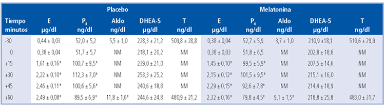 Valores corresponden a promedio ± EE. Una dosis única de melatonina (6 mg) o placebo fue ingerida 30 min antes de la inyección de ACTH. NM: no medido.