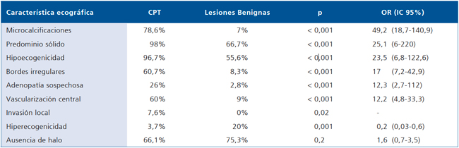 and hyperechogenicity (OR 0.2; CI 95% CI 0.03-0.6). Multivariate analysis disclosed microcalcifications