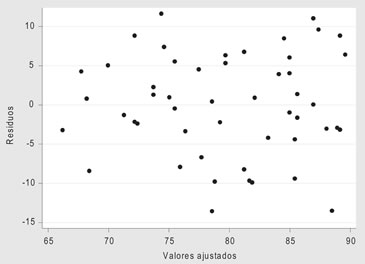 b) La homocedasticidad de los residuos o errores: Para probar este supuesto se comienza observando el gráfico entre los residuos y los valores predichos, en dicho gráfico no debería observarse ningún patrón de comportamiento: