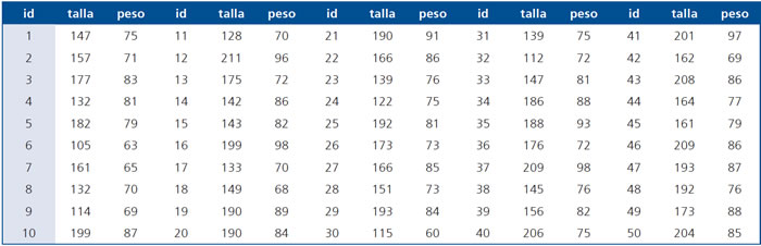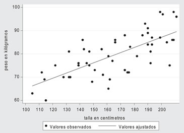 Ejemplo: Para los siguientes pares de tallas en centímetros y pesos en kilos, ¿Cómo y cuánto explica la talla al peso? (Ver tabla)
