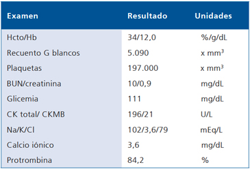 El cuadro clínico se inicia 3 semanas antes de su ingreso, con astenia, adinamia, anorexia y vómitos alimentarios escasos (3-4 episodios), motivo por el cual consulta a gastroenterólogo quién realiza endoscopía digestiva alta que revela gastropatía congestiva antral, indicándose tratamiento de erradicación de Helicobacter pylori; evolucionó con dolor urente epigástrico leve, algunos episodios de vómitos y deposiciones diarreicas (2-3 episodios al día). Por acentuación del compromiso del estado general consulta en urgencia, encontrándose hemodinámicamente estable, afebril, sin diarrea ni vómitos. Los exámenes practicados en esa ocasión se describen en la Tabla 1; de ellos, destaca la natremia de 102 mEq/L, por lo que se indica hospitalización en el Hospital del Salvador.