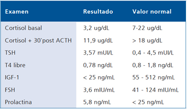 En la sala persiste con hiponatremia, a pesar de la restricción de agua libre, llegando a valores de 107 mEq/L; presentaba sólo bradipsiquia como síntoma atribuible al trastorno electrolítico, por lo cual se decide realizar estudio hormonal (Tabla 2). Con estos resultados y las claves clínicas de ausencia de pigmentación, de vello axilar y pubiano y de hiperkalemia y con buena tolerancia al estrés quirúrgico, se plantea la existencia de insuficiencia suprarrenal secundaria e hipopituitarismo.