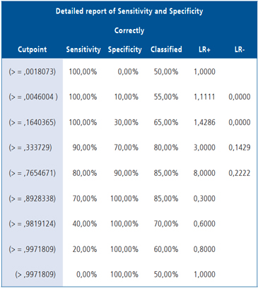 Así, dado un perfil X, la idea es determinar si la estimación de probabilidad hecha por la distribución logística está cerca del 0 o cerca del 1. Esta decisión es posible tomarla si se escoge un punto de corte, "p" para la probabilidad estimada, de modo que si P(Y = 1˧ |Xβ) > p, el sujeto será clasificado en la población "1", de lo contrario el sujeto será clasificado en la población "0". Con esta conceptualización, si la población de interés (enfermos, muertes, mejorías…) la llamamos "A" y la codificamos con "1", definimos: