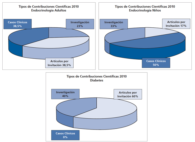 A continuación se presentan las principales figuras que explicitan el tipo de publicaciones en las distintas disciplinas de la Endocrinología y la contribución de los diferentes grupos al sostén de la Revista.