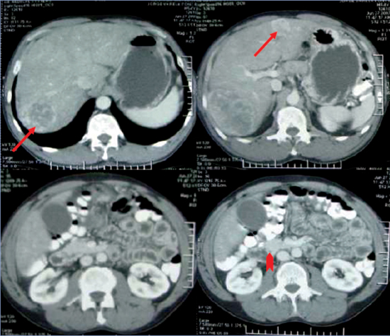 Figura 1. TC abdominal con contraste que revela la presencia de múltiples lesiones nodulares hepáticas (flechas) y una masa que engruesa el mesenterio y reduce parcialmente el lumen del íleon terminal (punta de flecha).