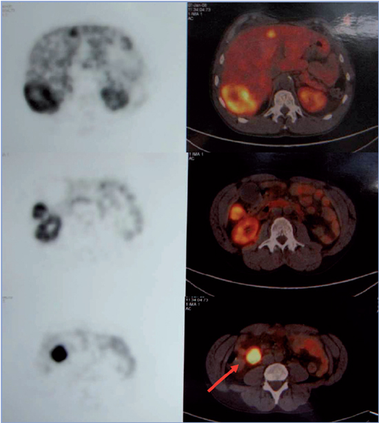 Figura 2. PET-TC Ga-68 DO-TATATE muestra hipercaptación multifocal en hígado e intestino delgado (flecha) compatible con carcinoide metastásico.