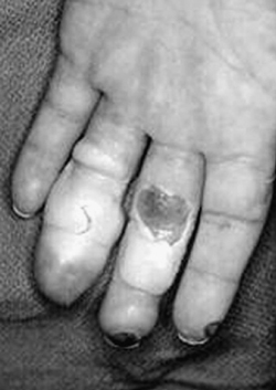 Corresponde a un engrosamiento de la piel (Figura 5) que aumenta progresivamente con la edad, a diferencia de la población no diabéticas en que la piel va disminuyendo su grosor con los años. Su prevalencia es variable (8 a 50%), si bien otras series describen entre 20-30% de los pacientes tanto diabéticos tipo 1 como tipo 2; son más frecuentes en aquellos con mal control metabólico. Algunos autores reportan que todos los diabéticos tipo 1 presentan algún grado de engrosamiento cutáneo27.