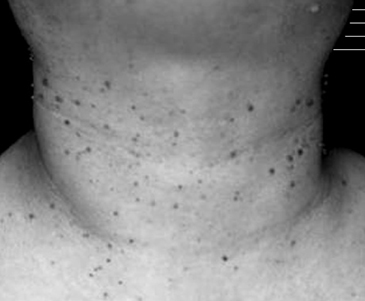 Corresponde a placas hiperpigmentadas, hiperqueratósicas, papilomatosas en zonas de pliegues (Figura 6) como axilas y cuello, pero pueden presentarse en otras áreas (pliegues inguinales, submamarios, ombligo, areolas y manos). Se ha reportado mayor frecuencia en razas de piel oscura28.