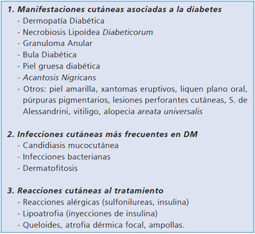 El compromiso cutáneo de la DM se puede clasificar en tres categorías: 1) enfermedades cutáneas con fuerte o relativa asociación con DM; 2) infecciones cutáneas más frecuentes en este tipo de pacientes; 3) reacciones cutáneas relacionadas con el tratamiento antidiabético (Tabla 1)9.