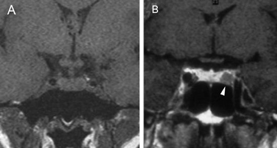 Figura 13A y B. Cortes coronales, secuencias T1w sin y con contraste. Antes de la inyección de gadolinio, el tumor se identifica a pesar de tener señal similar a la glándula (punta de flecha). El tumor muestra un borde superior convexo, se asocia con un piso selar cóncavo y a leve desviación del tallo pituitario a derecha, hallazgos que ayudan a localizarlo. Con el Gadolinio el adenoma se identifica con precisión al reforzarse la glándula pituitaria y los senos cavernosos, lo que permite visualizar la invasión del seno cavernoso izquierdo (punta de flecha).