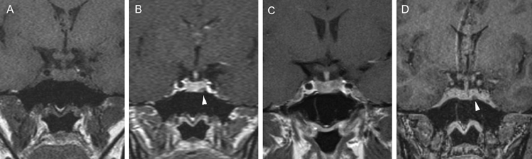 Figura 11A. Microadenoma pituitario productor de ACTH, corte coronal, secuencia T1w, muestra señal homogénea en la hipófisis. B. corte coronal (secuencia dinámica T1w con Gadolinio); se observa nódulo hipointenso de 3 mm (que aun no se refuerza) en cuadrante inferolateral izquierdo de la hipófisis (punta de flecha). C. corte coronal, secuencia tardía T1w con Gadolinio, muestra refuerzo heterogéneo de la glándula, no es posible precisar la ubicación del tumor. D. corte coronal, secuencia volumétrica SPGR T1w con Gadolinio de 1 mm de espesor, que muestra claramente la ubicación del tumor (punta de flecha). Esta secuencia ha mostrado mejores resultados en la evaluación de la enfermedad de Cushing.
