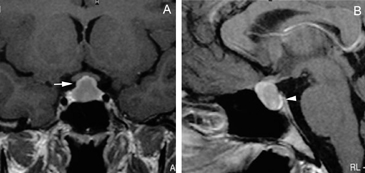 Los prolactinomas (Figuras 10A y 10B) se presentan frecuentemente como microadenomas en mujeres premenopáusicas con amenorrea y galactorrea34. En hombres, los prolactinomas pueden ser asintomáticos o desarrollar síntomas visuales o hipogonadismo hipogonadotrópico con pérdida de la libido e impotencia.