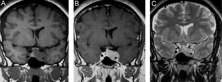 Figura 16A, B y C. Cortes coronales T1w sin y con Gadolinio y T2w. Macroadenoma con expansión asimétrica de la silla turca e invasión del seno cavernoso izquierdo.