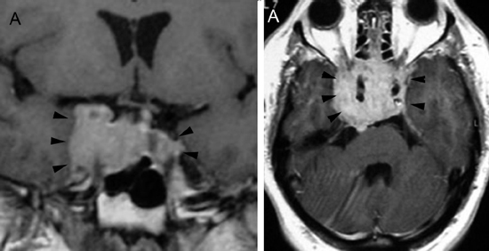 Figura 17A y B. Cortes coronal y axial transversal, T1w Gad. Macroadenoma con crecimiento hacia lateral (entre puntas de flecha), mayor a derecha con invasión de ambos senos cavernosos; el quiasma está libre.Los adenomas invasores (Figuras 18 y 19) constituyen un grupo aparte y de acuerdo con series recientes publicadas representan entre 10% a 35% de los adenomas pituitarios operados49. En estos casos el potencial de invasión es estimado con mayor precisión con estudios histoquímicos y ultraestructurales de las muestras obtenidas durante la cirugía. Estos estudios patológicos, en conjunto con la cuantía de tumor residual demostrada con las neuroimágenes postoperatorias, definirán la conducta terapéutica a seguir.
