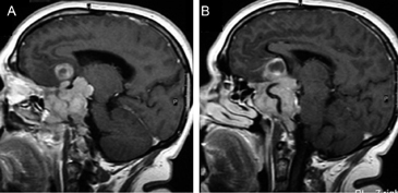 Figura 18A y B. Cortes sagitales, secuencia T1Gad. Macroadenoma invasor que se extiende al seno esfenoidal, al clivus, crece en el espacio retroselar, ocupa la cisterna supraselar y se extiende a la región subfrontal.