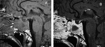 Figura 19A y B. Cortes sagitales T1w antes y después de inyección de Gadolinio. El tumor (prolactinoma) crece hacia caudal, invade el seno esfenoidal y erosiona el clivus (puntas de flecha), dejando libre la cisterna quiasmática. Los adenomas pituitarios invasores tienen características histológicas benignas, los malignos (carcinomas pituitarios) constituyen sólo el 0,2-0,5% de todos los tumores pituitarios50 y generalmente son macroadenomas funcionantes recidivados,que se presentan con metástasis subaracnoideas, cerebrales o sistémicas (Figuras 20 A, 20B, 20C y 20D).