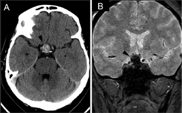Figura 21A. Corte axial transversal a nivel de la cisterna supraselar. La cisterna esta ocupada por una masa pituitaria espontáneamente hiperdensa compatible con hemorragia reciente (punta de flecha). La paciente se presentó con un cuadro de cefalea intenso, que se interpretó inicialmente como una hemorragia subaracnoidea. B. Corte coronal del mismo paciente, secuencia gradiente se observa la extensión supraselar de un adenoma pituitario con una señal muy hipointensa, por la presencia de sangre (punta de flecha). Esta secuencia es muy sensible para detectar hemorragia, ya que la sangre extravasada produce artefactos de susceptibilidad magnética que aparecen como focos de hiposeñal en la imagen.