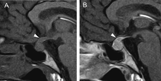 Figura 24 A y B. Hipofisitis, cortes sagitales, secuencias T1w antes y después de la inyección de Gadolinio, se observa aumento de volumen de la pituitaria y del infundíbulo, que muestran un refuerzo intenso y homogéneo (punta de flecha). Quiste de la bolsa de Rathke