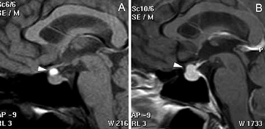 Las imágenes más características en la RM son un aumento de tamaño simétrico de la glándula pituitaria, una estructura homogénea pre y postgadolinio, con refuerzo intenso después de la inyección de contraste paramagnético. (Figuras 24A y 24B).