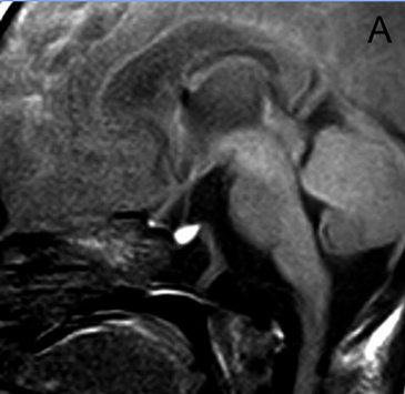 Figura 4A. Corte sagital, secuencia T1w. Glándula pituitaria normal en adulto joven (27 años), muestra foco posterior de hiperseñal de la neurohipófisis (punta de flecha); la señal de la adenohipófisis es similar a la de la protuberancia.