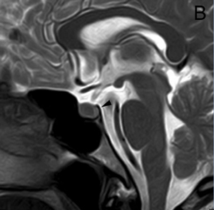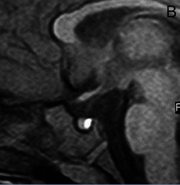 Figura 8. Corte sagital, secuencia T1w con Gadolinio, se observa un pequeño quiste de la pars intermedia (punta de flecha), inmediatamente inferior al tallo pituitario.