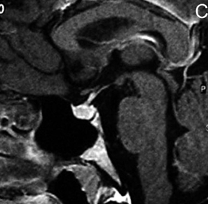 Figura 4C. Corte sagital, secuencia T1w post inyección de Gadolinio. La glándula pituitaria, muestra refuerzo normal incluyendo el tallo pituitario; en el cerebro solo se refuerzan las estructuras vasculares.