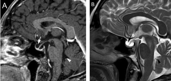 Figura 9A y B. Cortes sagitales, secuencias T1wl con Gadolinio y T2w, muestran la hipófisis en la porción inferior de la fosa pituitaria, lo que es secundario a una herniación de la cisterna supraselar (flecha). Obsérvese que el tallo pituitario esta también descendido. La secuencia T2w permite confirmar que la señal del líquido en la fosa pituitaria es similar al LCR del IV ventrículo (punta de flecha). Tumores pituitarios