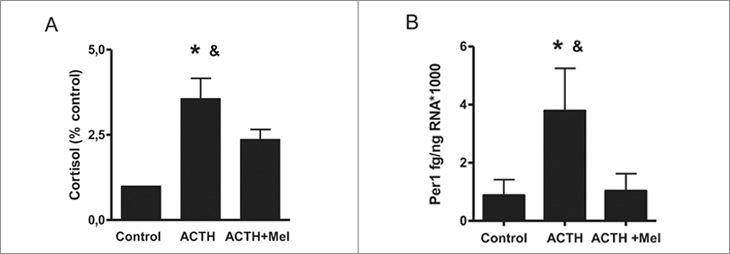 El tratamiento por 12 h con ACTH aumentó la producción de cortisol expresada como porcentaje de la producción por explantes de suprarrenal tratados con medio solo. Asimismo, aumento la expresión del gen reloj Per1. La presencia de melatonina en el medio inhibió ambos efectos de ACTH (Figuras 2A y 2B, respectivamente).