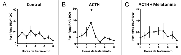12 horas, *P < 0,05, distinto del control y distinto de ACTH + Mel,