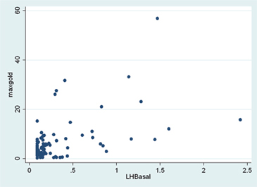 Figura 3. Correlación de LH basal con LH estimulada (mUI/mL).