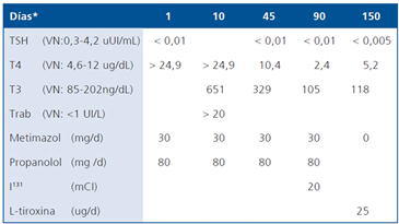 En su primera consulta aportaba los siguientes exámenes: TSH: <0,01 (VN: 0,3-4,2 uUI/mL), T4: >24,9 (VN: 4,6- 12 ug/dL), T3: 631 (VN: 84,6-201,8 ng/dL), Trab >20 (VN:<1 UI/L), Colesterol total 127 (VN <200 mg/dL), GGT 65 (VN 4 - 50 U/L). Con el diagnóstico de enfermedad de Basedow- Graves, se inicia tratamiento con metimazol (30 mg/d) y propanolol (80 mg/d).
