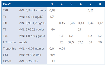 La Tabla 2 resume la evolución de la función tiroidea y los exámenes bioquímicos cardiológicos a partir de la hospitalización de urgencia.