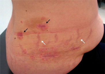 las incisiones de los puertos de laparoscopía (flechas negras). Ocho meses despúes de la cirugía, la paciente ha disminuido en 27 kilos su peso corporal y mantiene un buen control metabólico. Desde el punto de vista de la psoriasis, ha presentado exacerbaciones ocasionales con buena respuesta a tratamiento con corticoides tópicos.